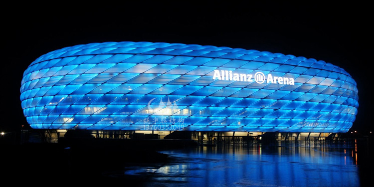 安聯(lián)球場由2874個菱形膜結(jié)構(gòu)構(gòu)成,膜結(jié)構(gòu)具有自清潔,防火、防水以及隔熱性能,每個膜結(jié)構(gòu)都可以在夜間被照成紅藍(lán)白三色,分別對應(yīng)于拜仁、1860以及德國國家隊的隊服顏色。